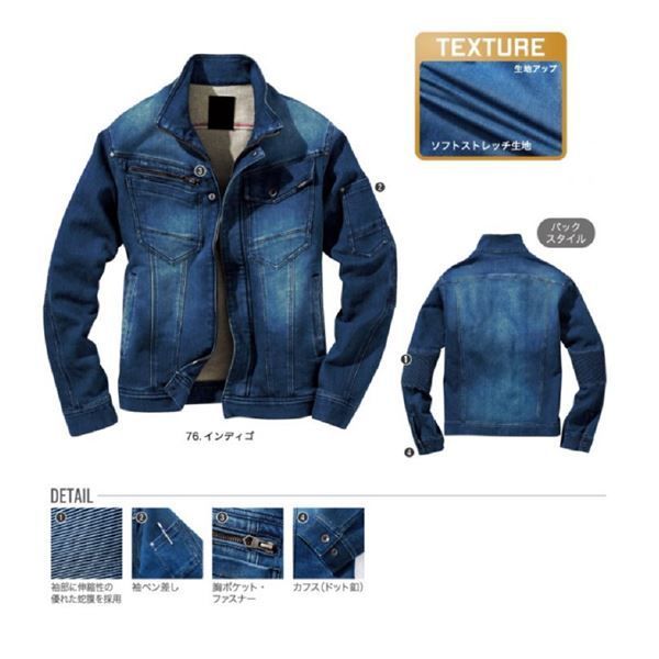 袖部に伸縮性の優れた蛇腹を採用したデニムジャケットです。